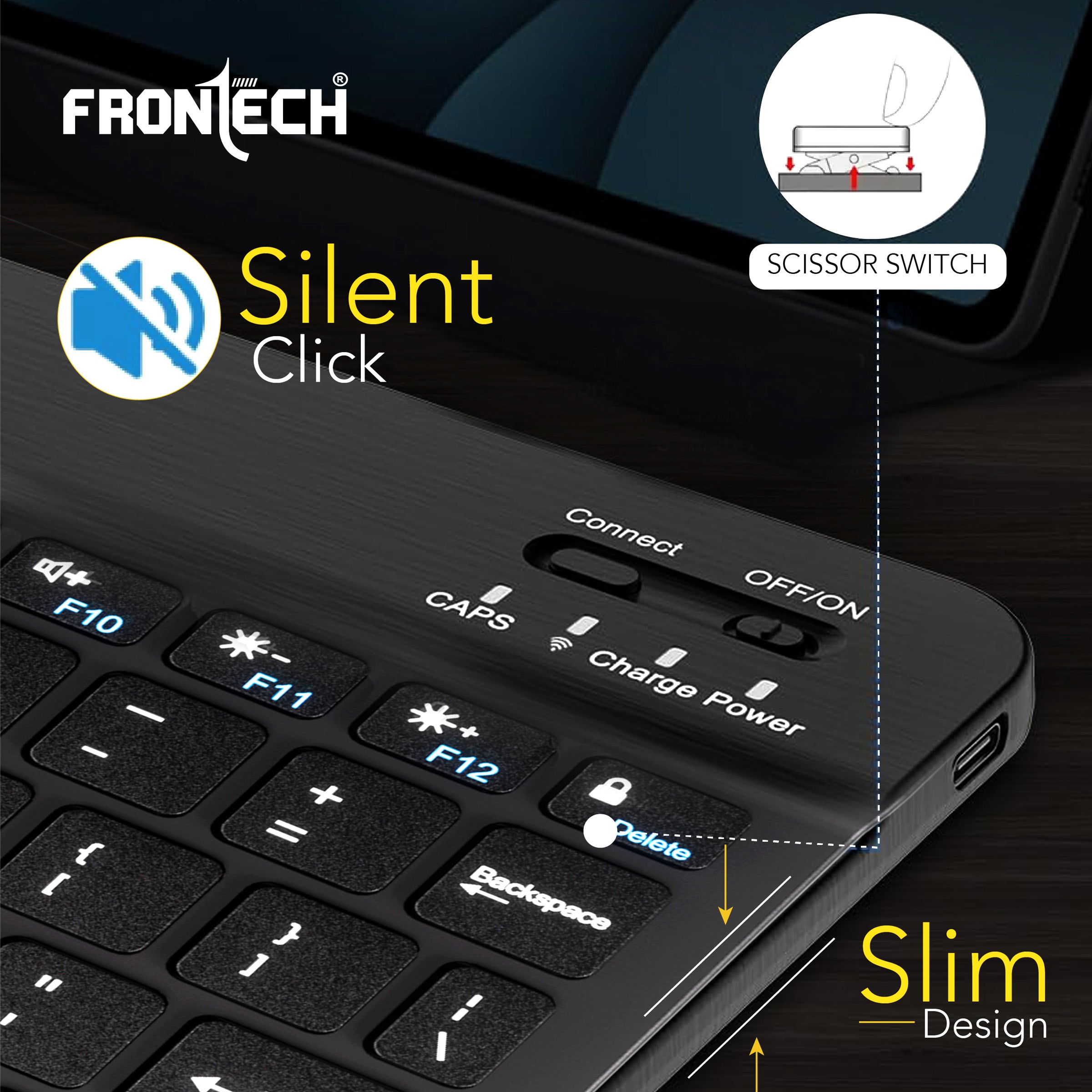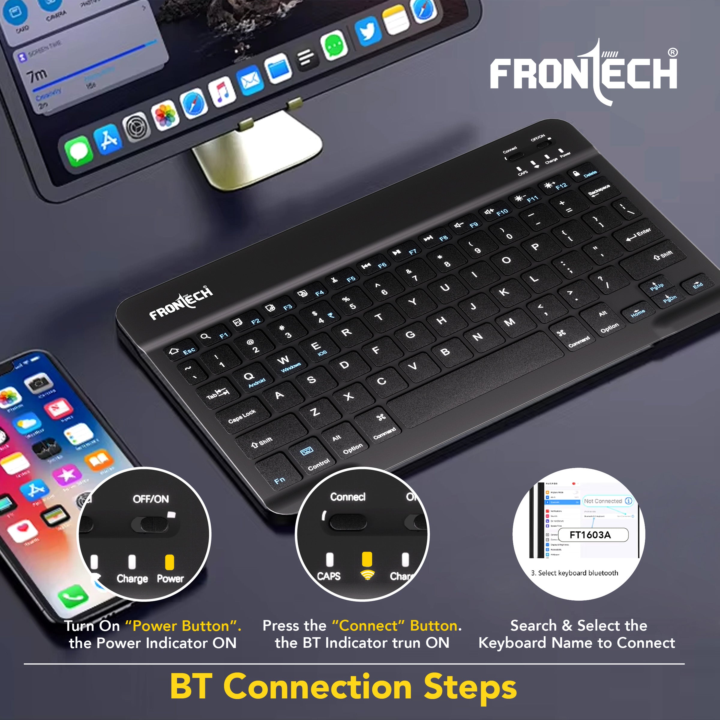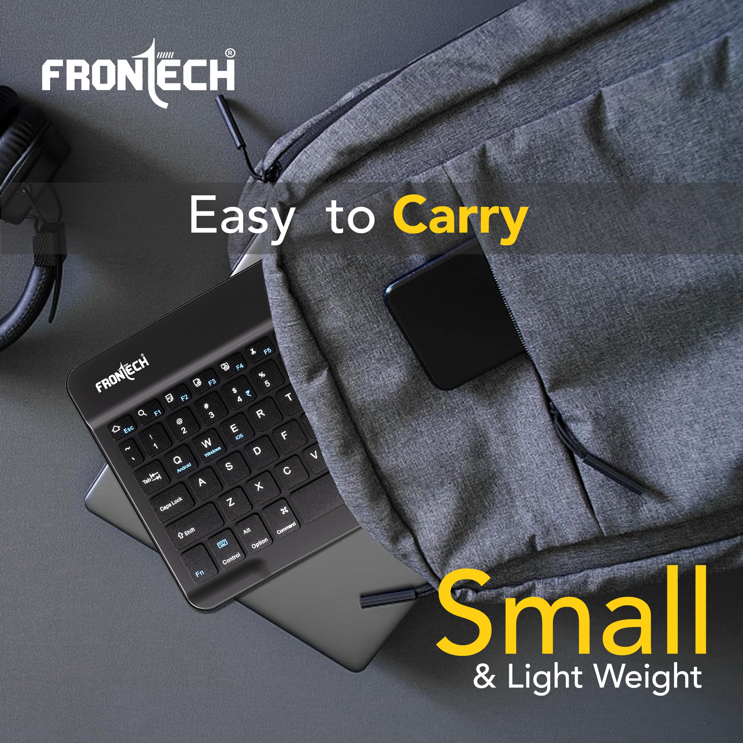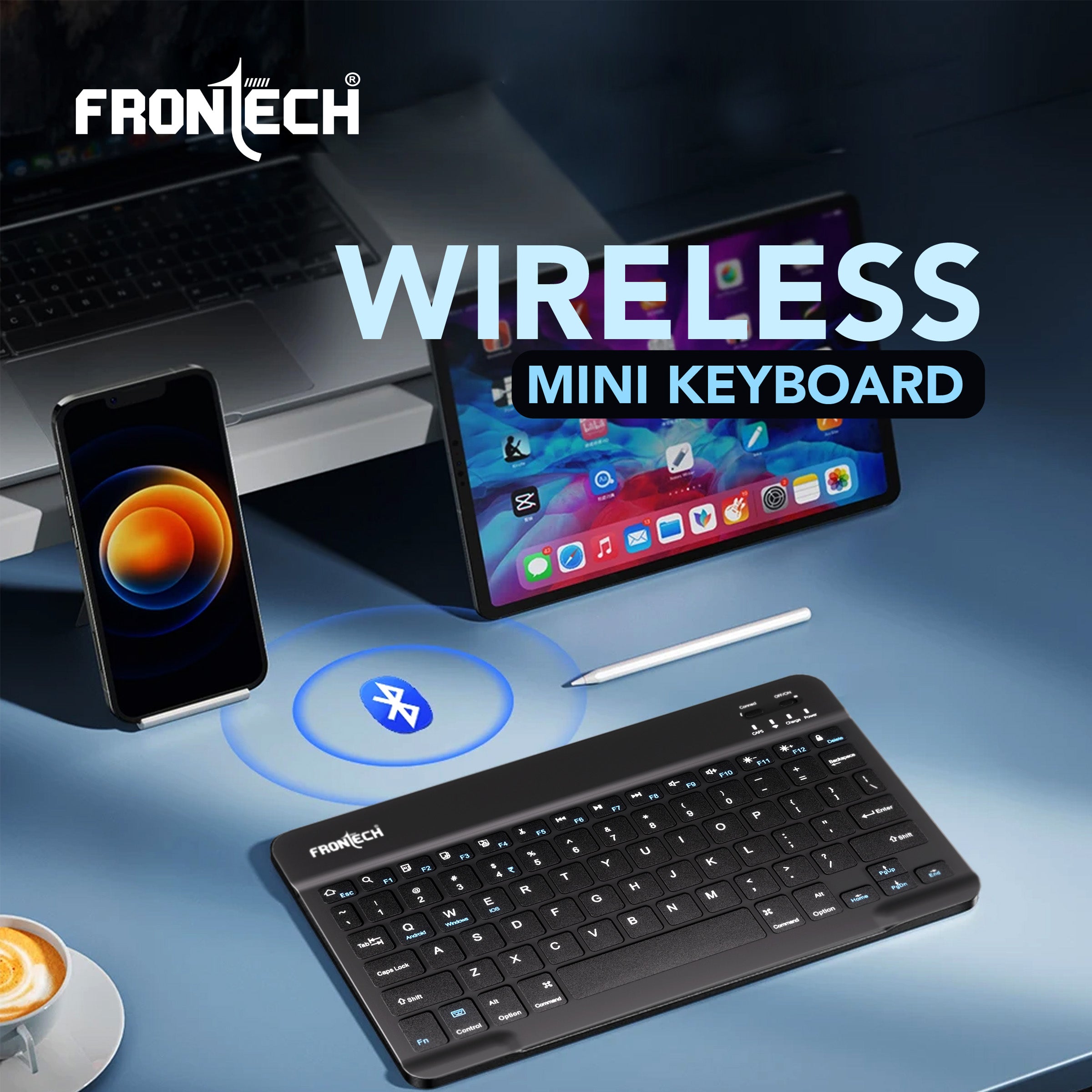 The Frontech FT-1603A is an ultra-slim and compact wireless mini Bluetooth keyboard, featuring 78 standard keys for a complete typing experience. It boasts a 120mAh rechargeable battery for convenient use and is universally compatible with Windows, Mac, Android, and iOS operating systems. Weighing only 186g and with dimensions of 247×150×8 mm (WxDxH), this black keyboard is highly portable and space-saving. Manufactured and marketed by Frontech Private Limited, it comes with a 1-year limited warranty