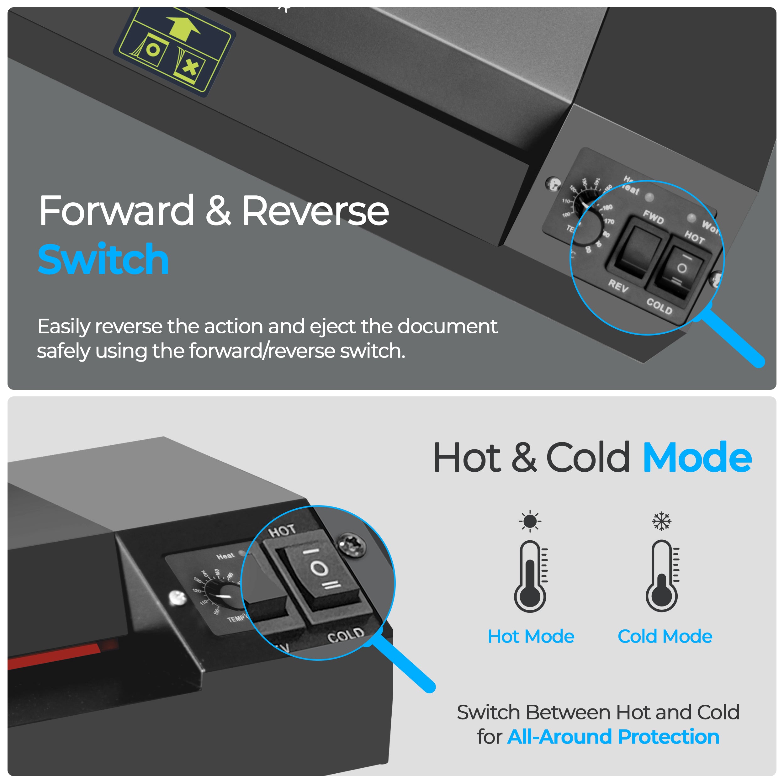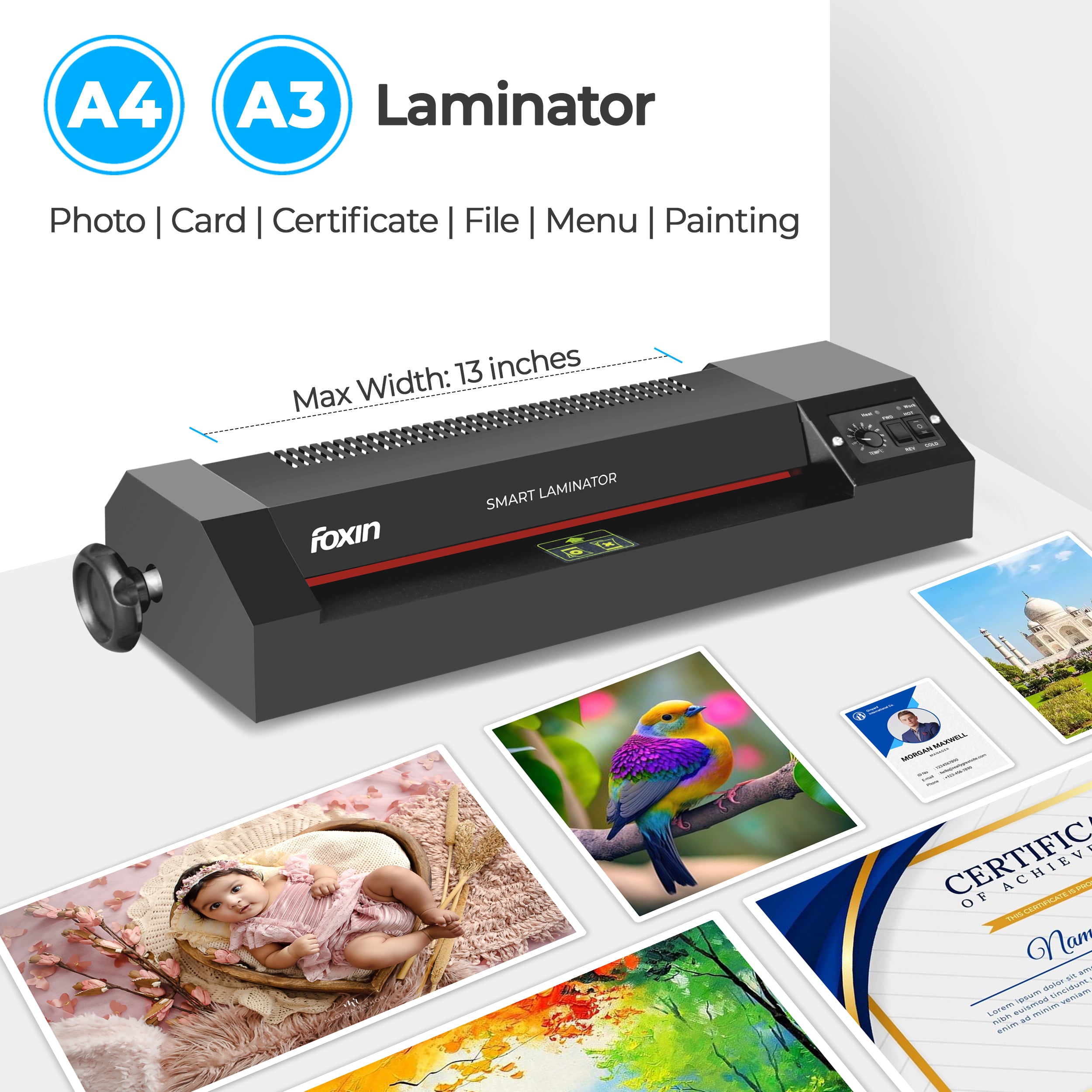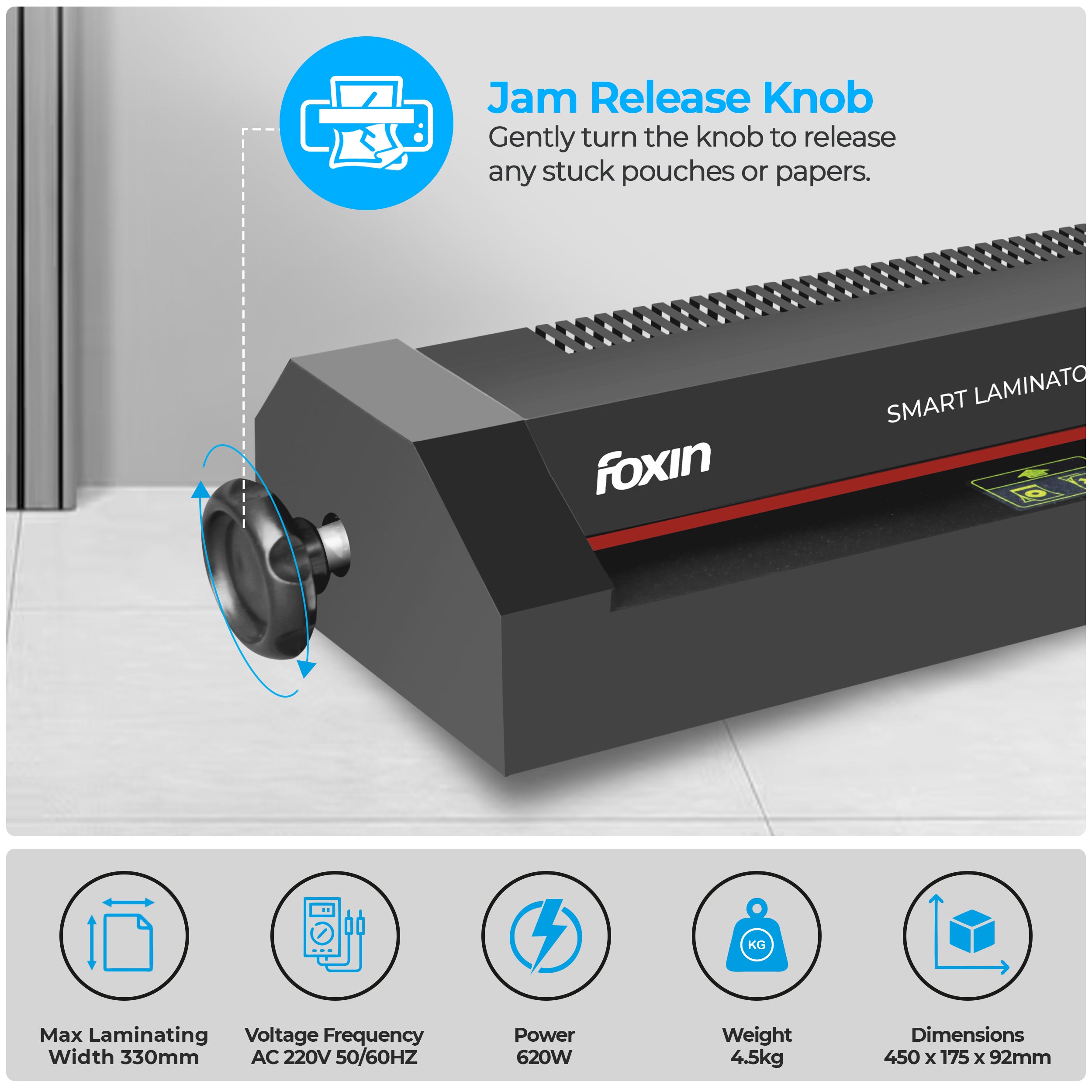 The Foxin Metal Laminator ensures flawless, bubble-free lamination with its advanced 4-roller system for smooth and wrinkle-free results. Save time with a 3-minute warm-up and a speedy 60-second lamination per sheet, perfect for quick tasks at school, office or commercial use. Built to last with a sturdy metal body and sleek design that adds style and durability to your workspace. Equipped with an adjustable temperature control knob and advanced jam release control knob for hot and cold lamination without hassle. Compatible with A3 and A4 documents, making it ideal for certificates, photos, licenses, and more, and backed by a 1-year warranty for reliability.