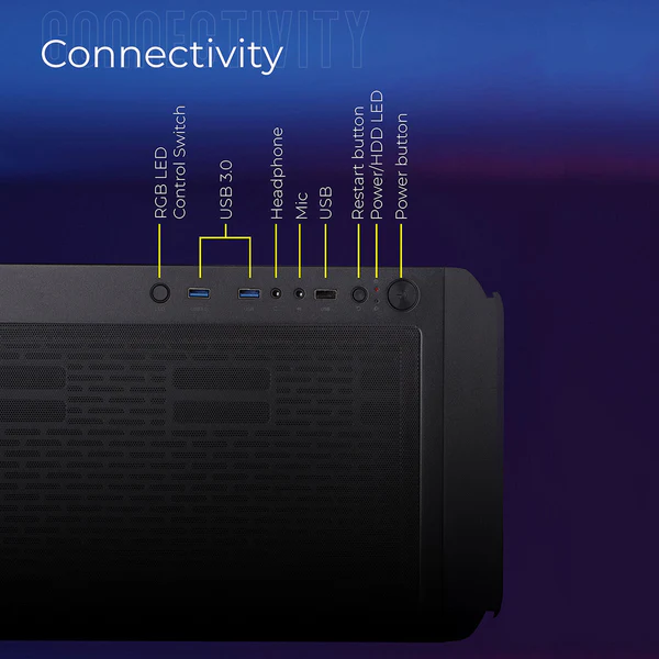 The chassis comes with 4 pre-installed ARGB LED cooling fans with an inner LED glow and a front mesh to enhance the visual outlook. There is one 140mm fans on the rear and 3 x 140mm fans on the front. Additionally, you can also add 2 more 140mm cooling fans on the top. These fans can be synced with the motherboard ARGB and can turn on its color-changing option from the computer through ARGB control. It also has a LED control switch that can also control all its 27 LED light modes.