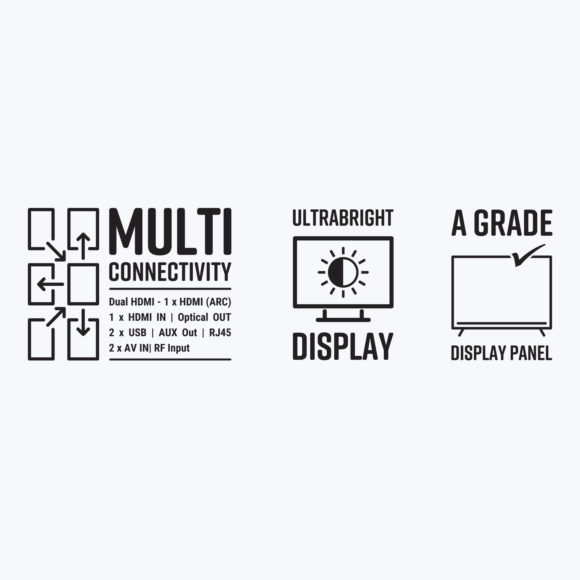 | Connectivity | Dual HDMI - 1 x HDMI (ARC) | 1 x HDMI IN | Optical OUT | 2 x USB | AUX Out | 2 x AV IN | RJ45 | RF input | |