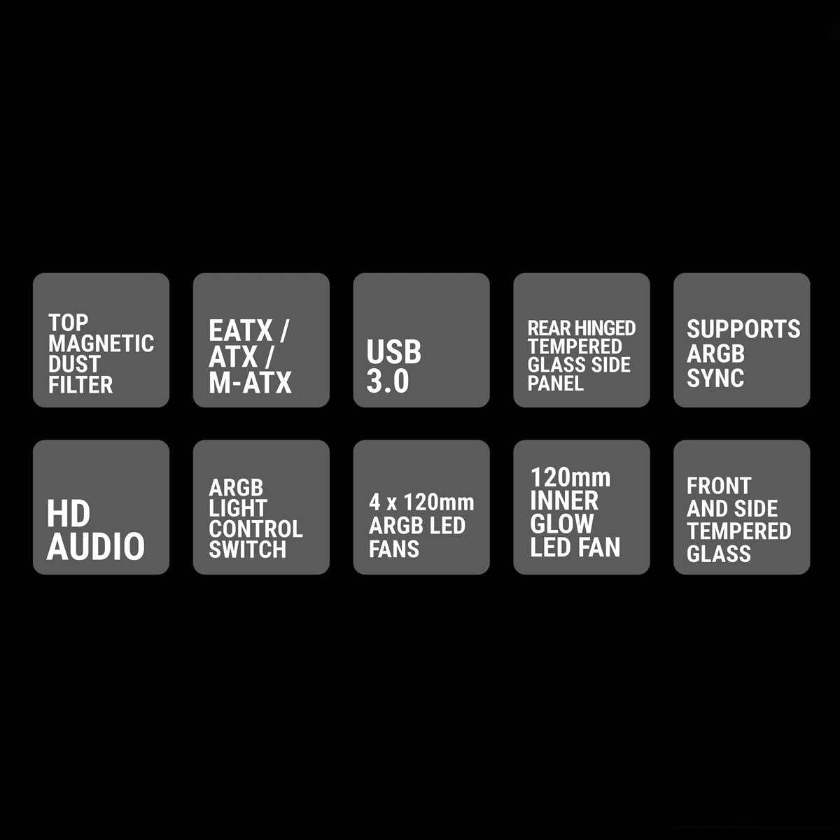 | Side panels | Tempered Glass & Magnetic Door |