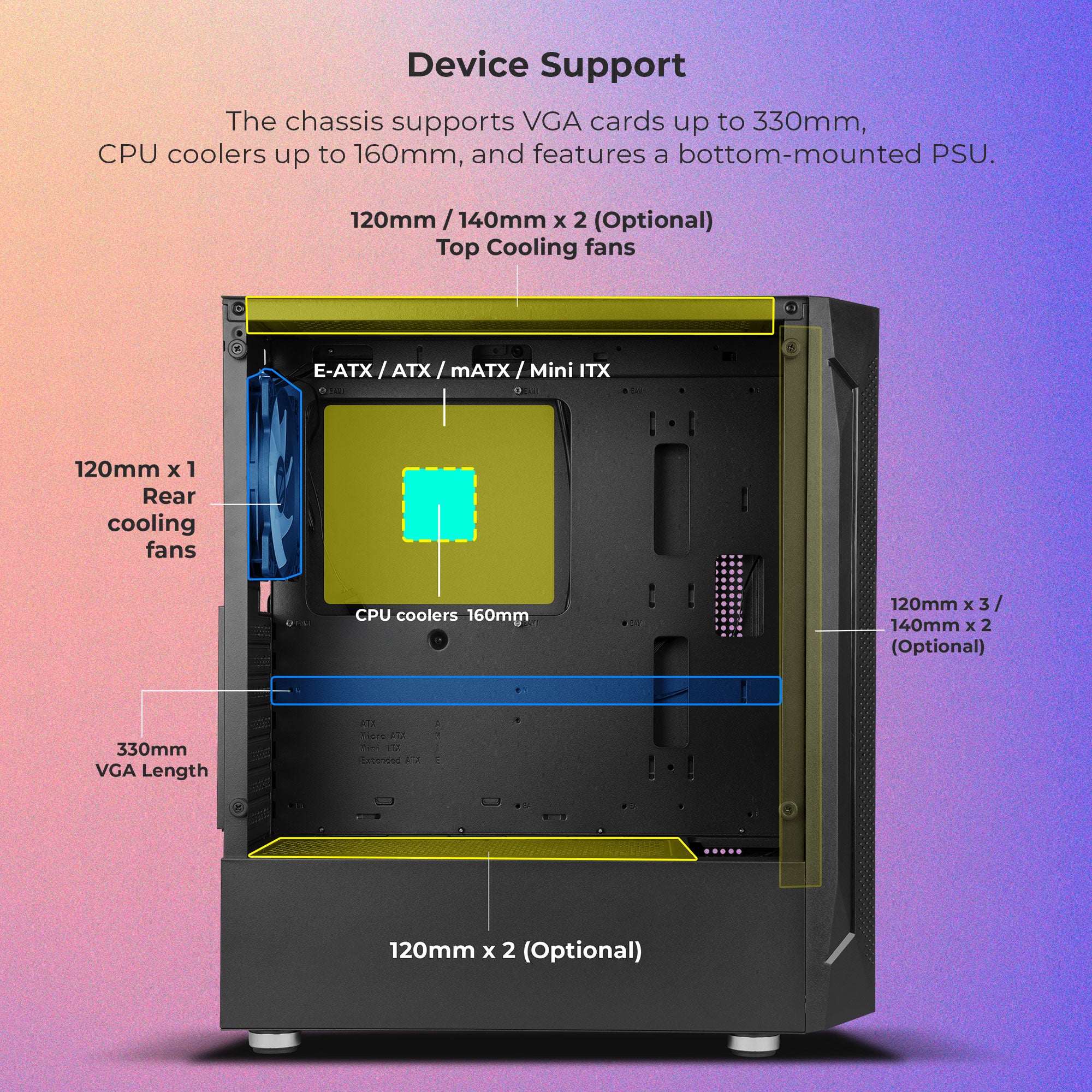 | PSU Cover | 120mm x 2 (Optional) | |