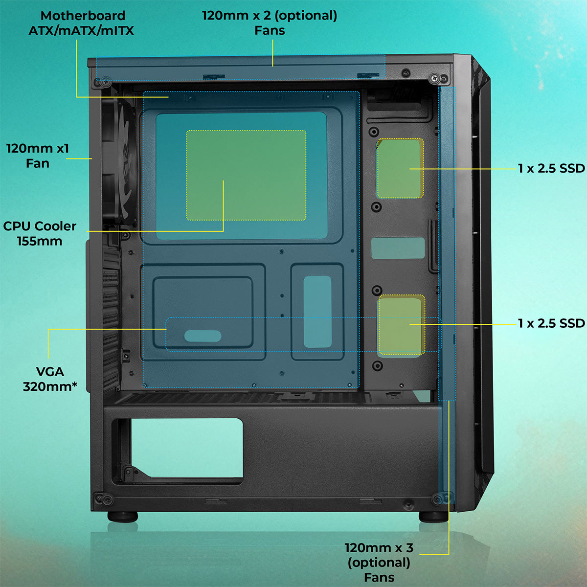 Tempered Glass side panel | 120mm RGB Fan | Heavy Duty Structure | Optimized design for airflow | Bottom PSU | AIO cooler support* | LED control switch | Front LED strip | USB 3.0