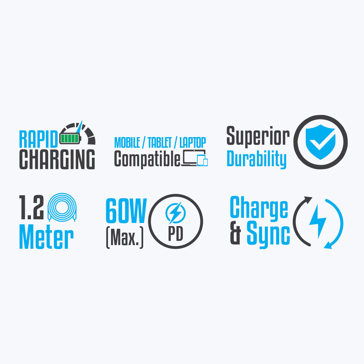 PD 60W (max) | Rapid Charging | 1.2 Meter | Charge & Sync | Superior Durability | Mobile/Tablet/Laptop Compatible | Country of Origin : China