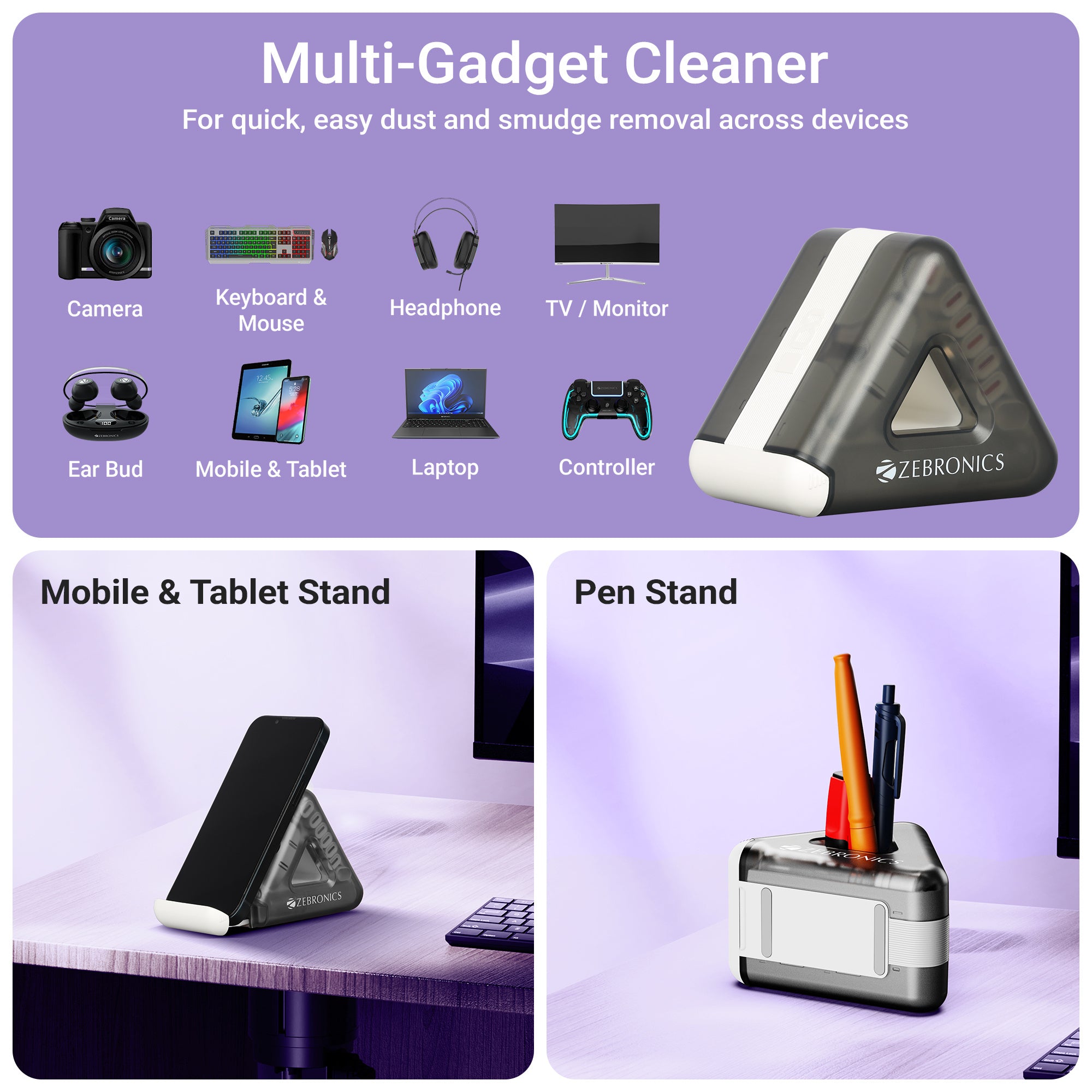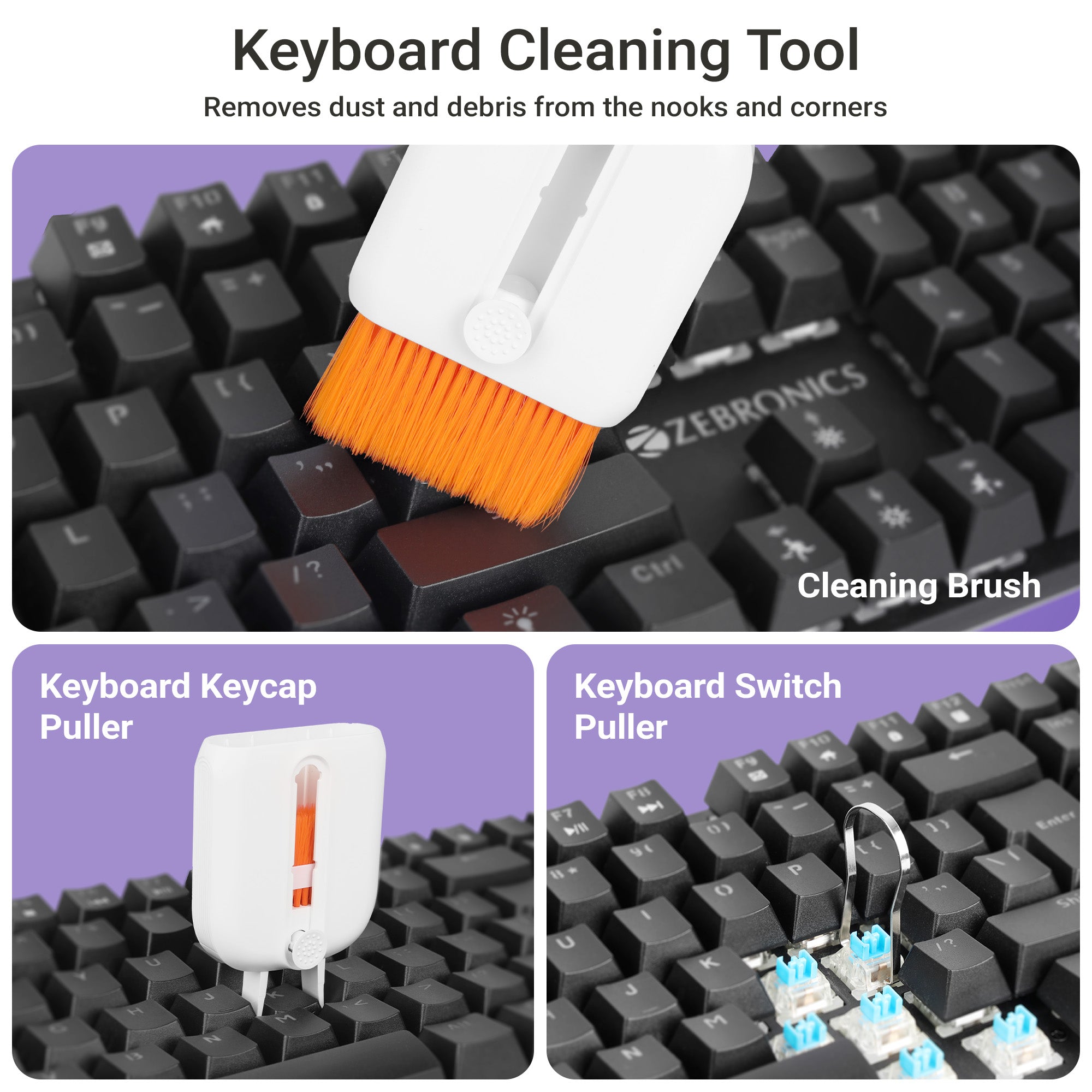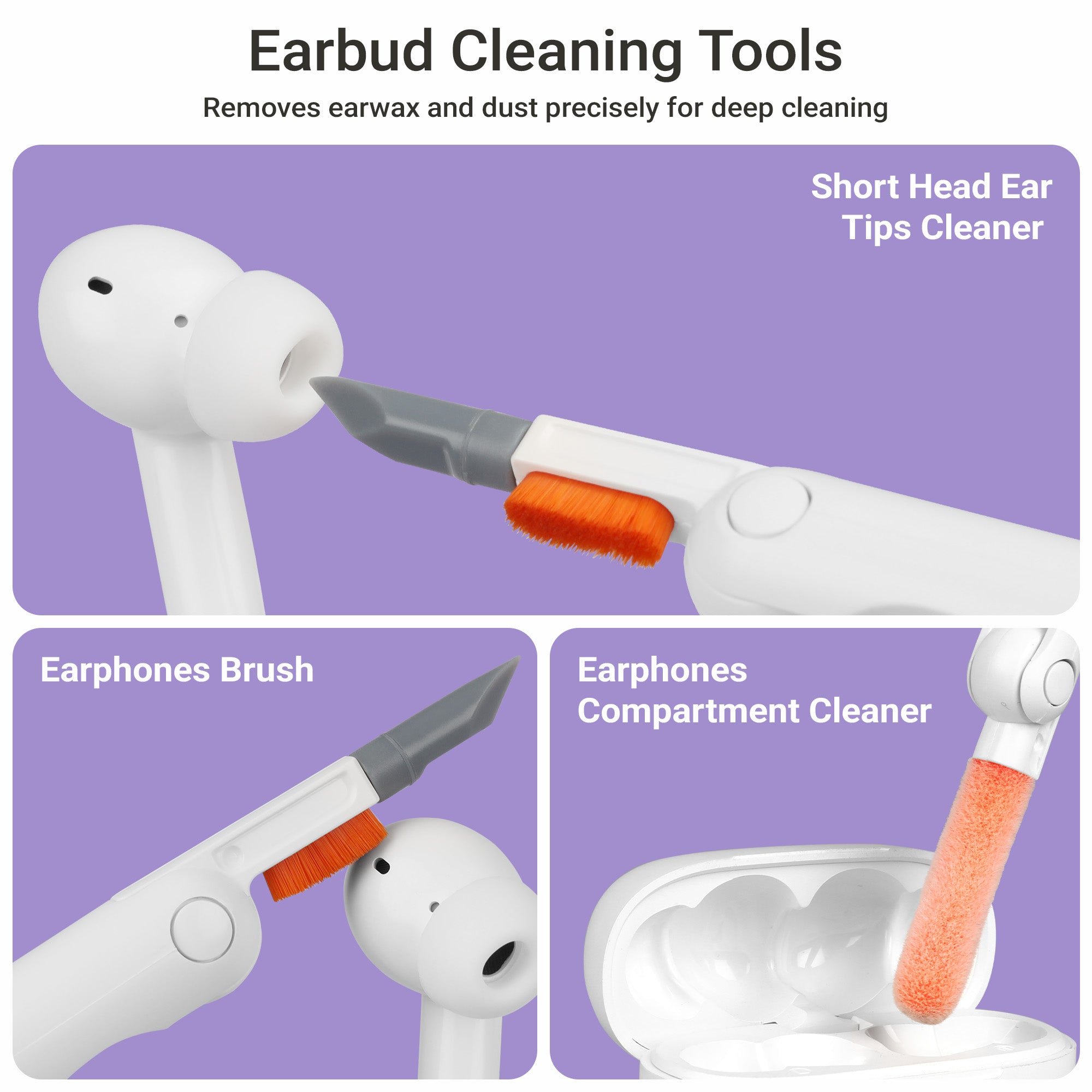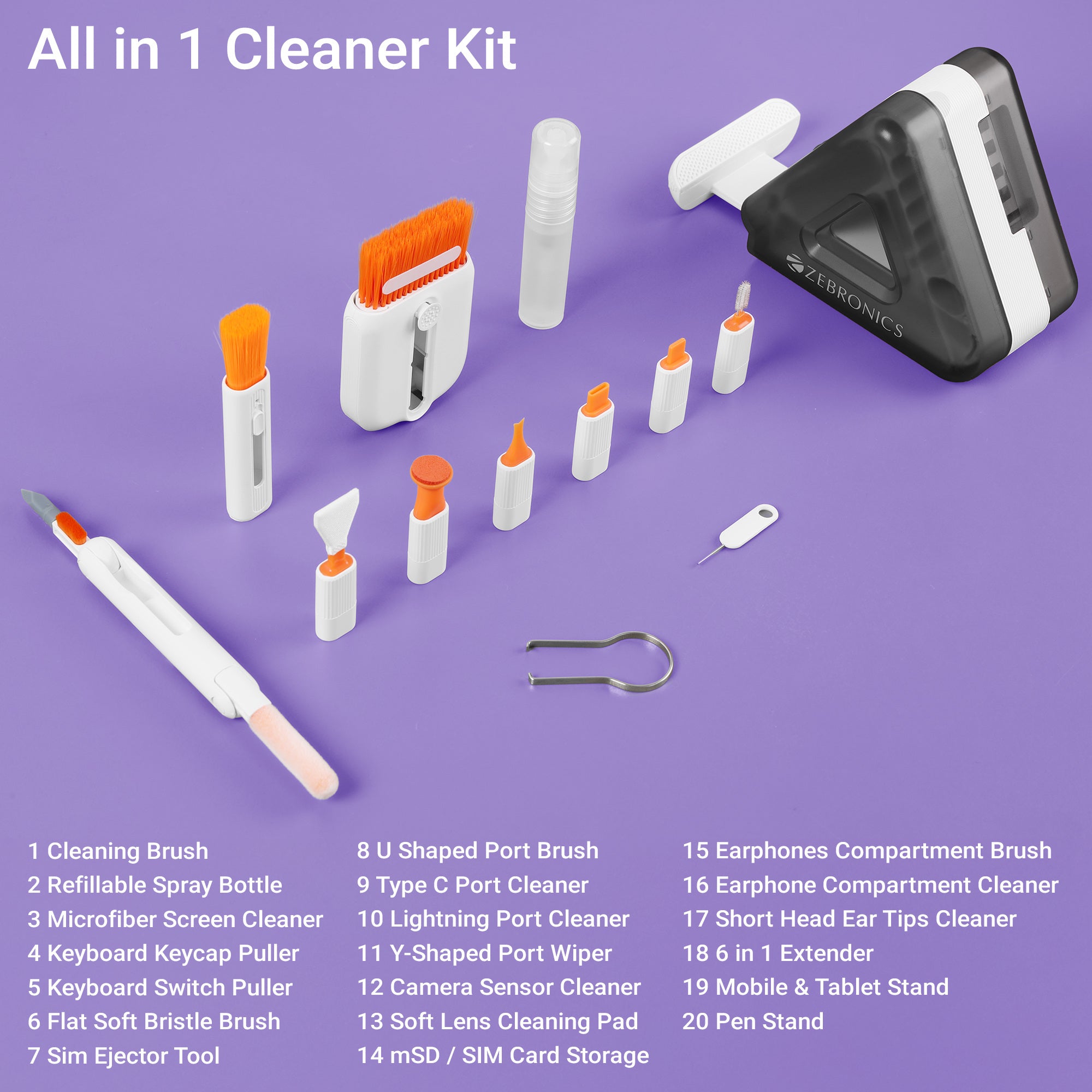 | Tools and description | Cleaning BrushRefillable Spray BottleMicrofiber screen cleanerKeyboard Keycap pullerKeyboard Switch pullerFlat soft bristle brushSim Ejector ToolU Shaped Port BrushType C Port CleanerLightning Port CleanerY-Shaped Port WiperCamera Sensor CleanerSoft Lens Cleaning padmSD / SIM Card StorageEarphones compartment brushEarphone compartment cleanerShort head Ear tips cleaner 6 in 1 Extender Mobile & Tablet StandPen Stand | |