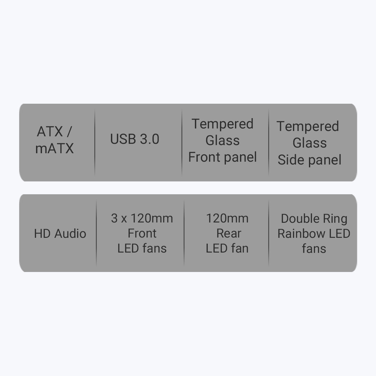 | Cooling fans | Double Ring Rainbow LED fans \ Front 120mm x 3\ Rear 120mm x 1 \ Bottom 120 mm x 2 (optional) | |