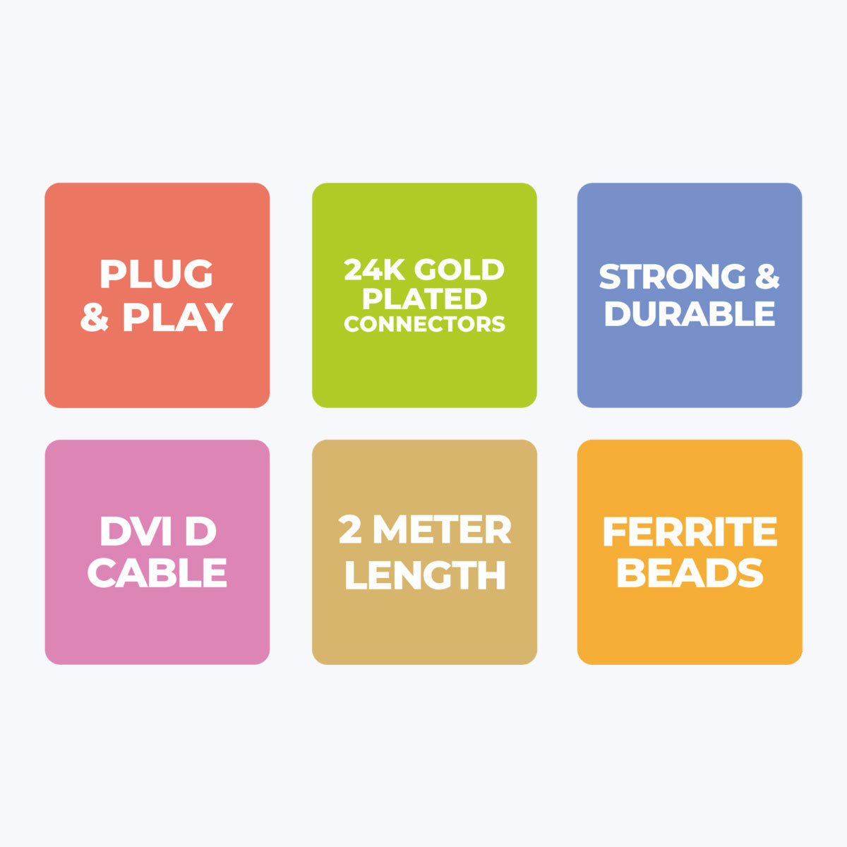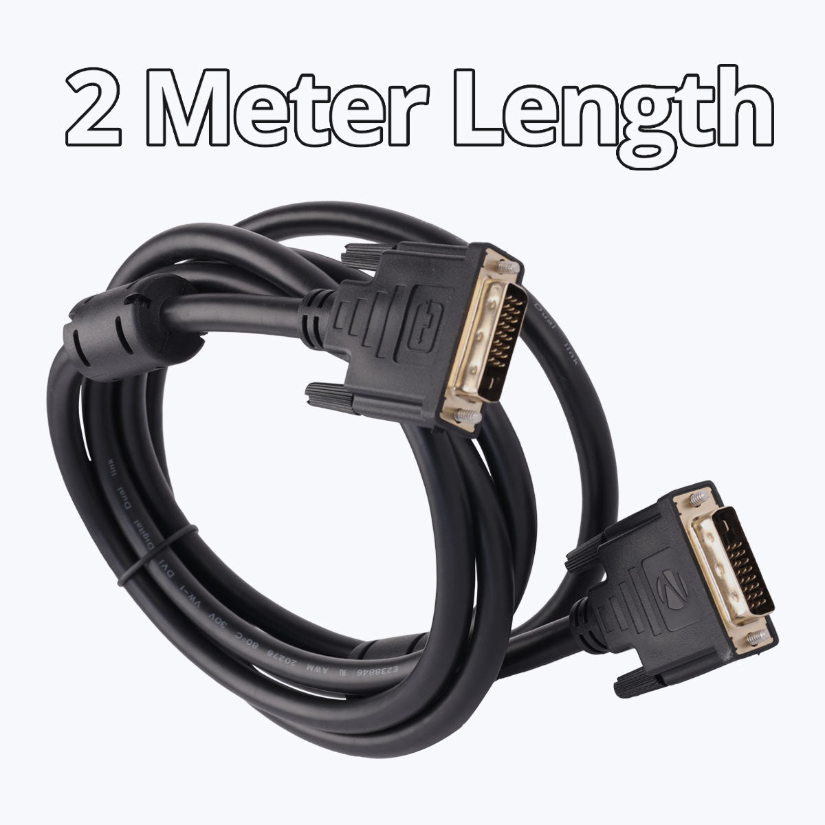 DVI D Cable | Dual Link | Bi-directional | Compatible with devices like TVs, displays, | A/V receivers, Blu-ray players, computers, Playstation & more | 4k @ 60Hz Supported | HDR Supported | Strong and durable | Plug & Play | Ferrite Beads to avoid interference | 2 Meter Length | 24K Gold-Plated Connectors | Package Dimension (WxDxH) : 180x42x196 mm | Country of Origin : People’s Republic of China | Package contents | DVI to DVI Cable