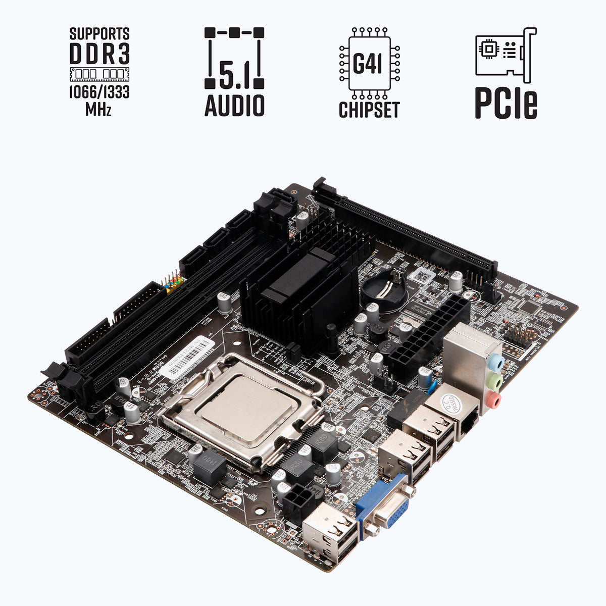 | I/O Interface | 1 x VGA Port, 6 x USB 2.0 ports, RJ45 LAN port, 1 x 3-in-1 audio jacks |