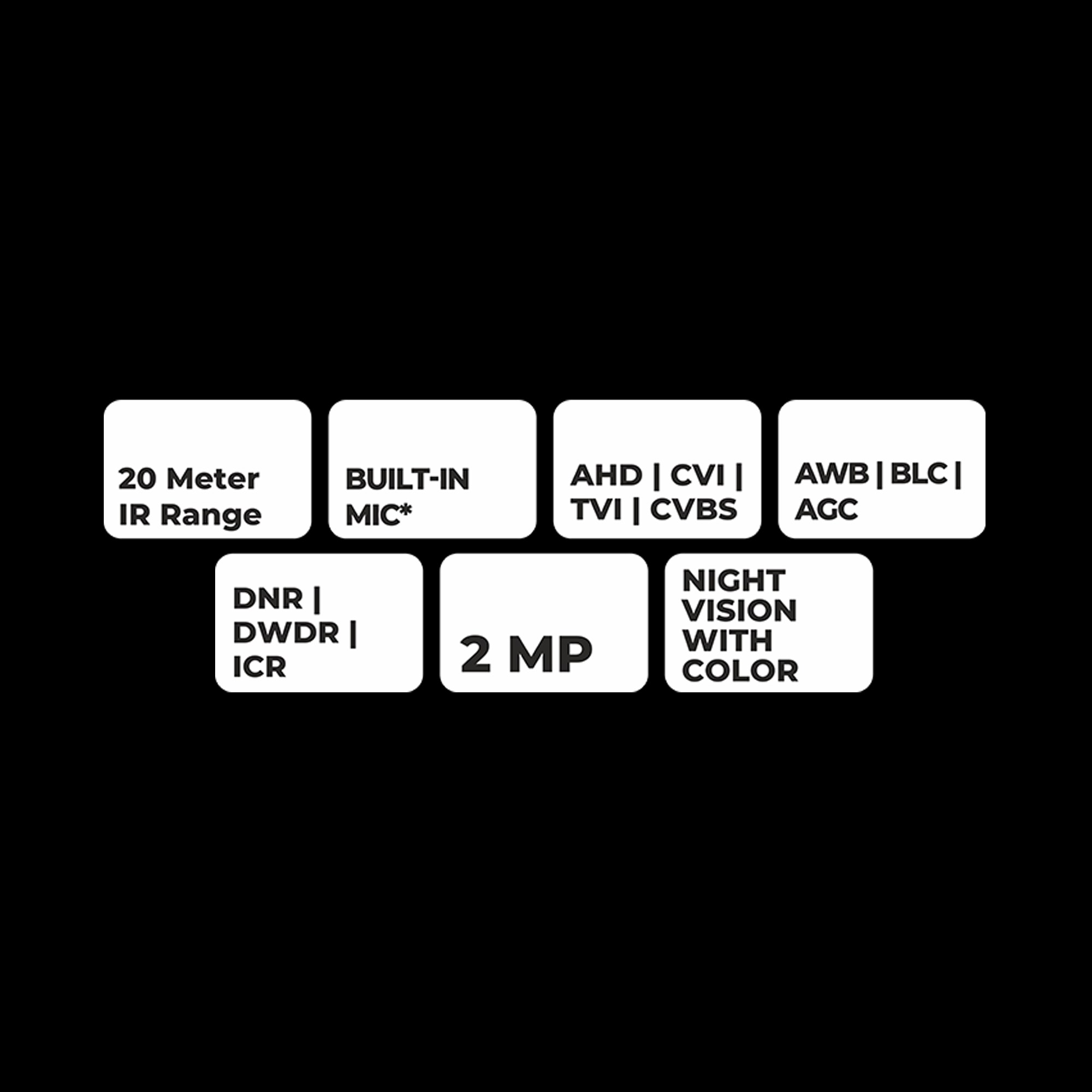| Video output | TVI:2MP@25/30fpsAHD:2MP@25/30fpsCVI:2MP@25/30fpsCVBS:PAL/NSTC | |