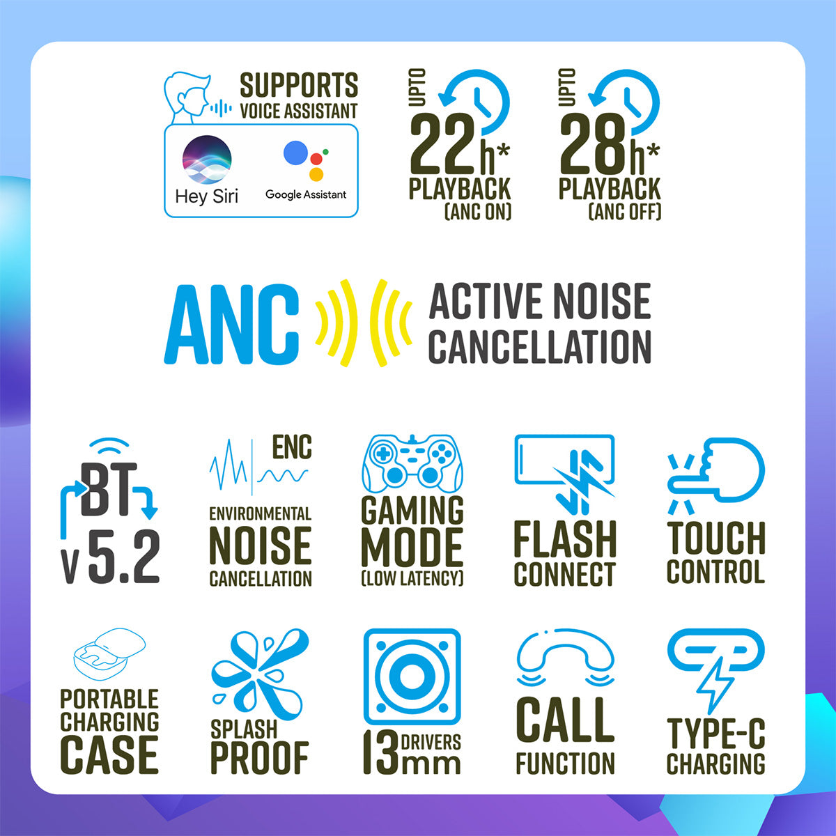 | Playback Time | 6h*( ANC ON) 7h*(ANC OFF) |