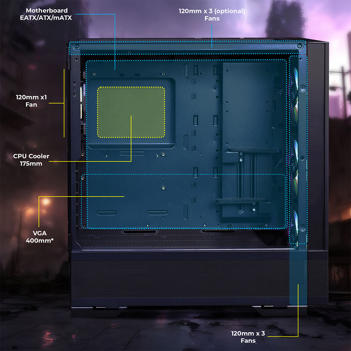 | Side panels | Tempered glass + Metal (Left & Right) |