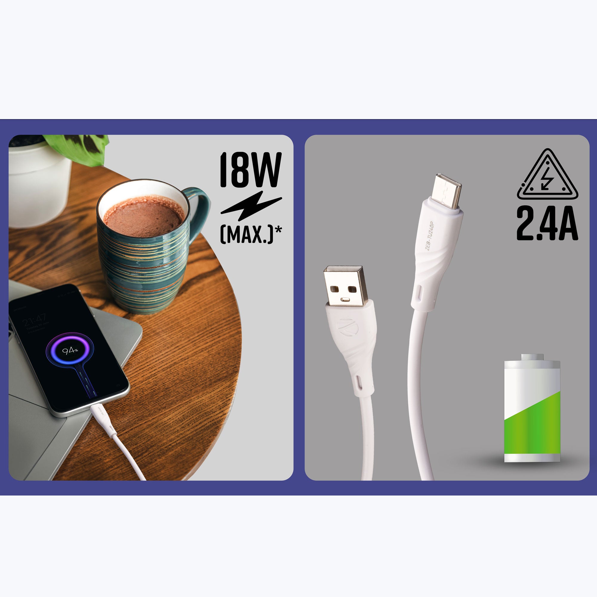 2.4A | 1 Meter | Charge & Sync | Superior Durability | 10000+ Bends tested | 18W (Max.) * | Rapid Charging | Made in India | Package contents | Cable : 1 Meter