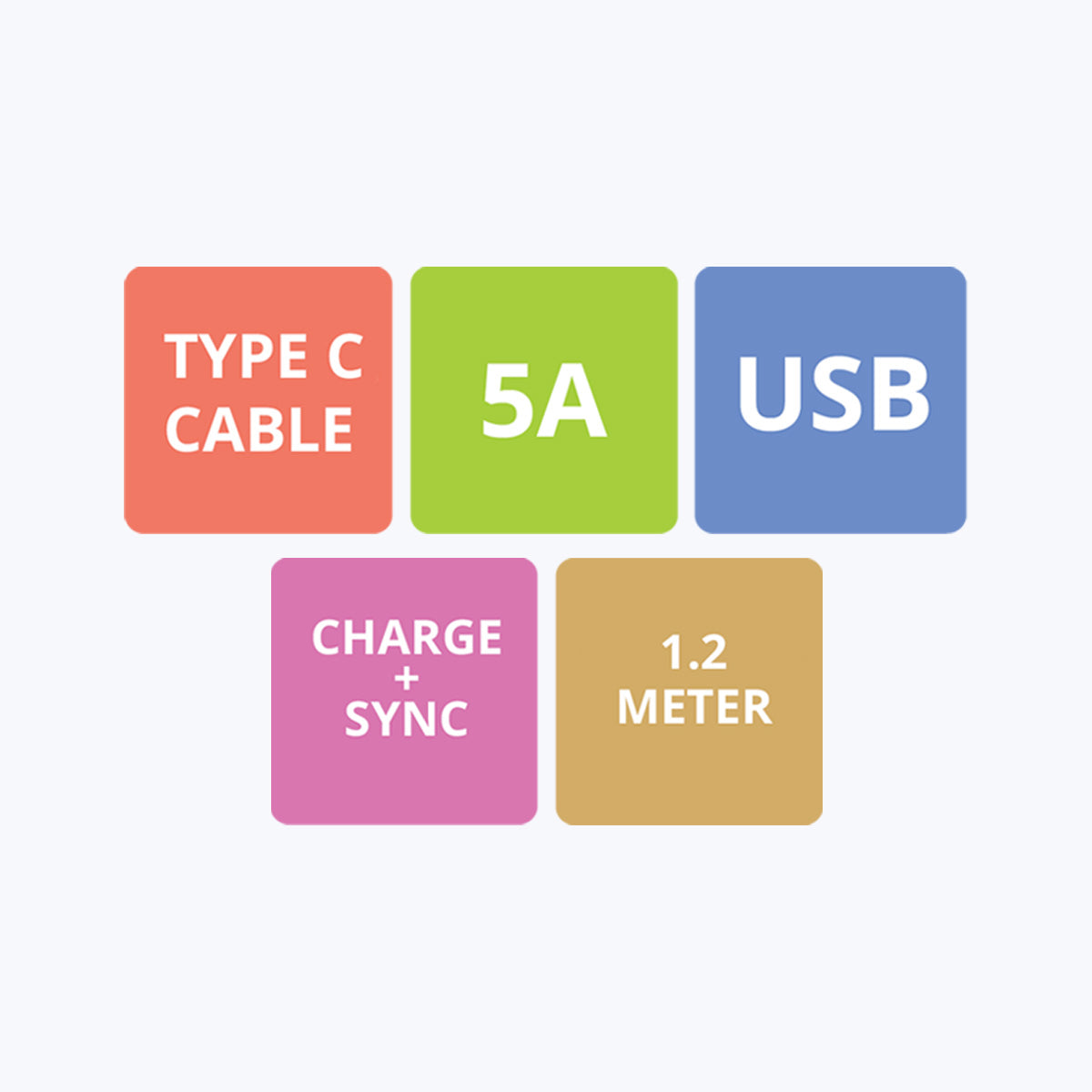 USB to Type C cable | Hi speed charging with 5A | Charge and sync | 1.2 meter length | Metal connector for durability | Strong and long lasting sleeved cable | Rigorous stress tests done for reliability | Country of Origin : China