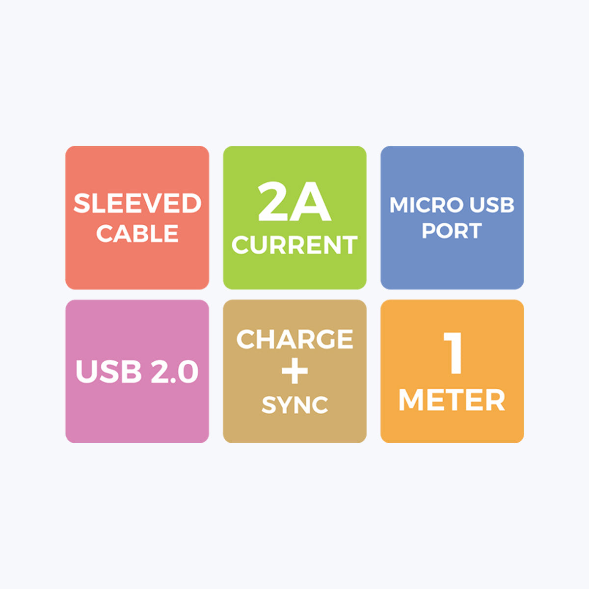 USB 2.0 | Micro USB cable | Hi speed charging with 2 Ampere current | Charge and sync | 1 meter length | Strong and long lasting sleeved cable | Rigorous stress tests done for reliability | Country of Origin : China