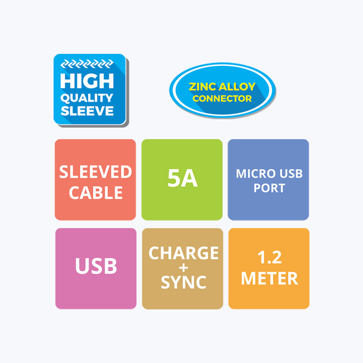 USB to Micro USB cable | Hi speed charging with 5A | Charge and sync | 1.2 meter length | Zinc alloy connector for durability | Strong and long lasting sleeved cable | Rigorous stress tests done for reliability | Country of Origin : China