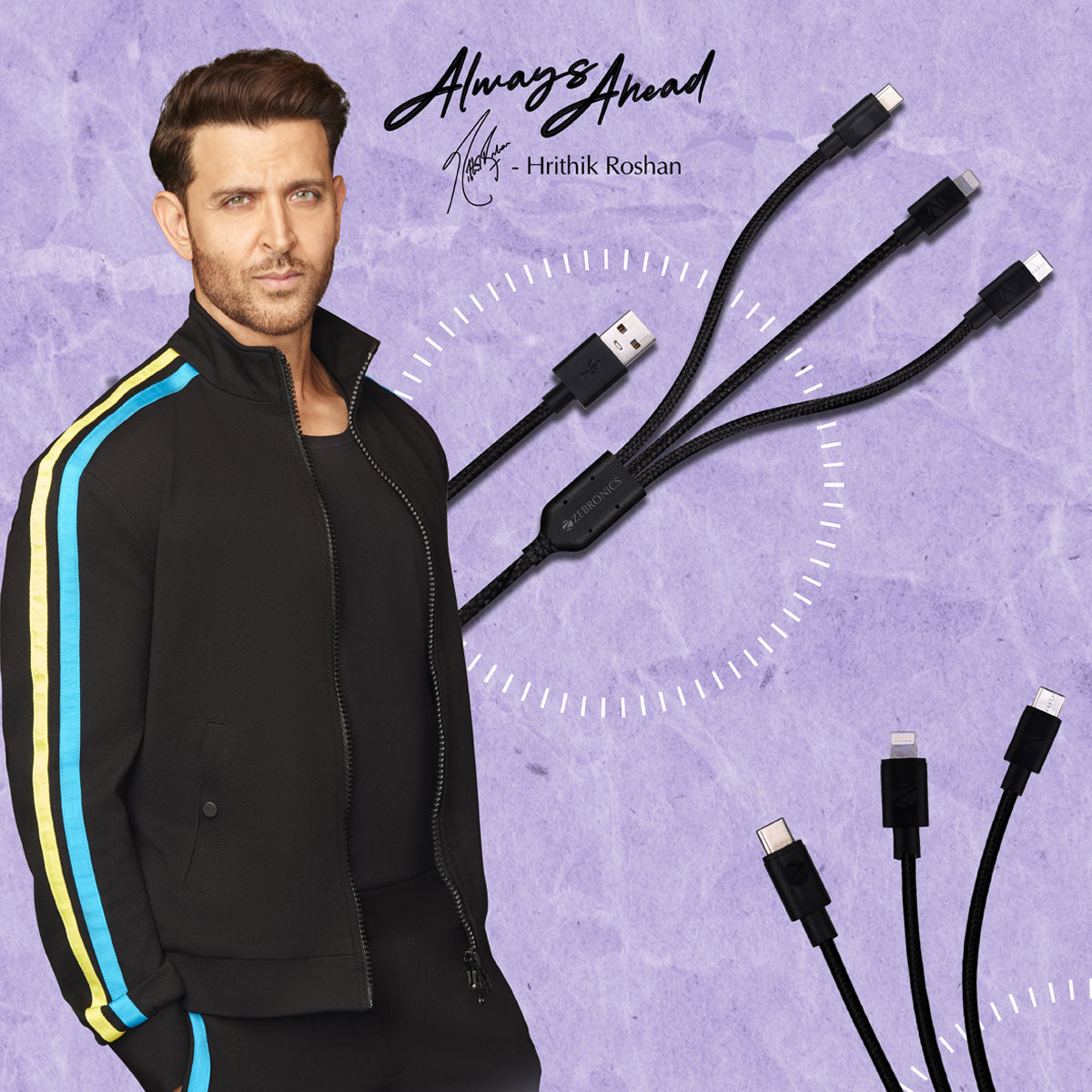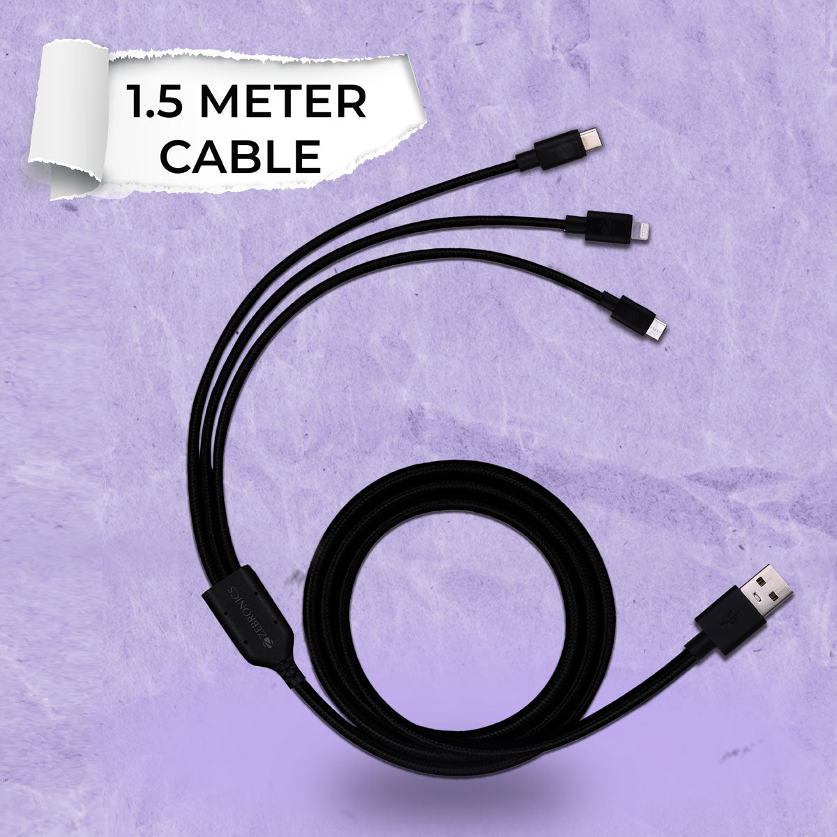 Lightning, Type-C & Micro USB output | 3A max | 1.5 Meter | Braided cable | Simultaneous charging | Net weight: 55g | Country of Origin : India | Package Contents | Cable : 1U