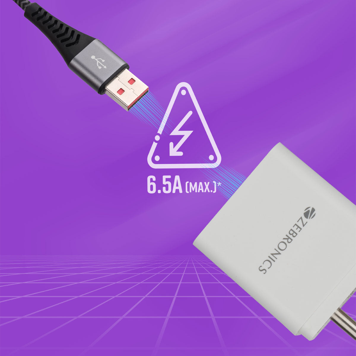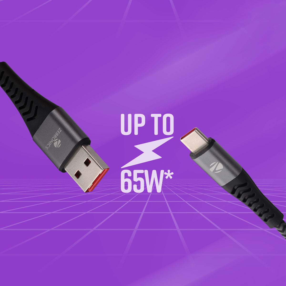 Rapid Charging | Up to 65W* | Multi-Protocols Support* | 6.5A (Max.) | 1 Meter | Charge & Sync | Superior Durability | Braided Cable | Country of Origin : India | Package content | Cable : 1 U | *With compatible adapters