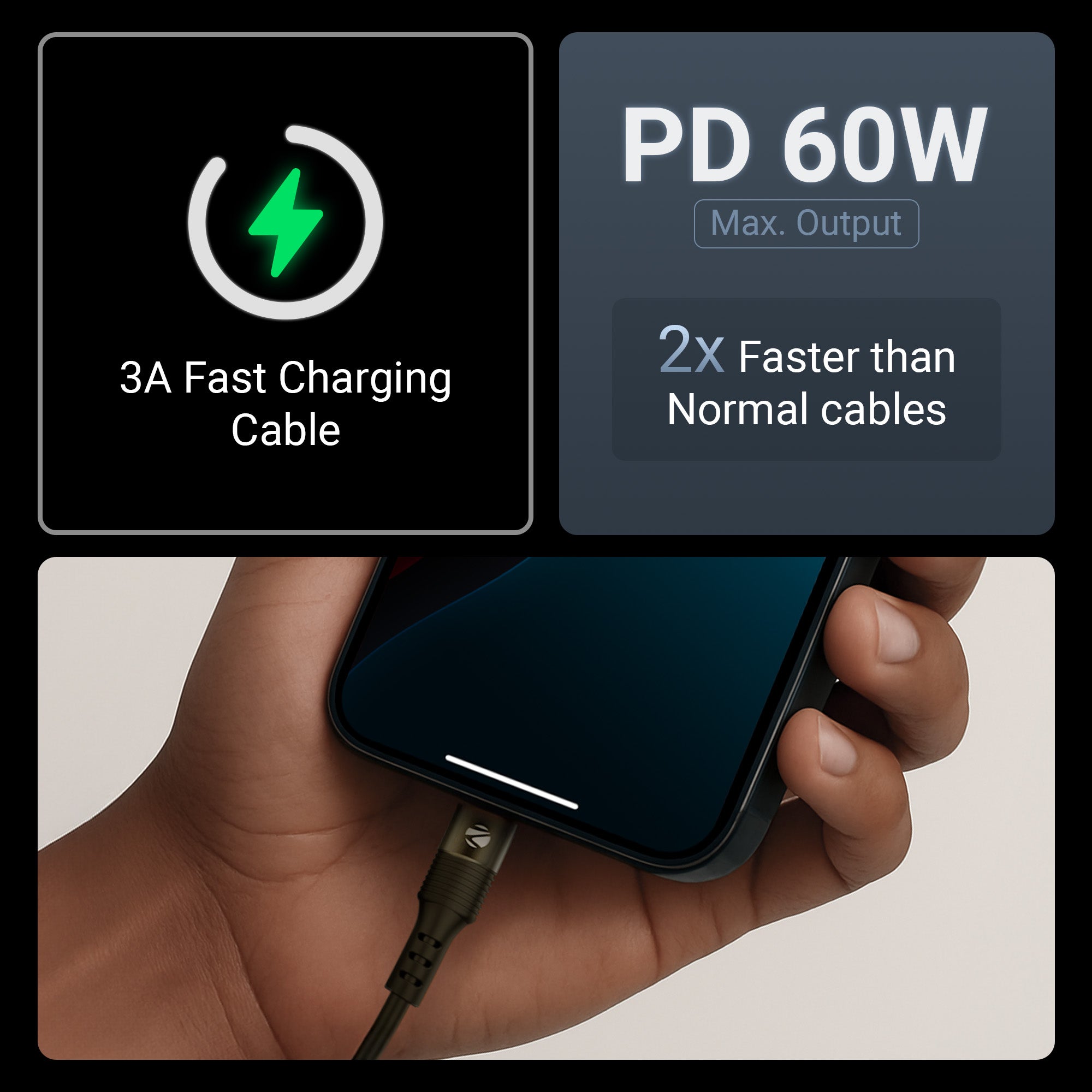 PD 60W (Max.) | 3A (Max.) | 1 Meter Cable | Charge & Sync | Rapid Charging | Superior Durability | Super Soft Silicon | Mobile/Tablet/Laptop Compatible | Country of Origin : PRC | Package Content | Cable : 1 Meter
