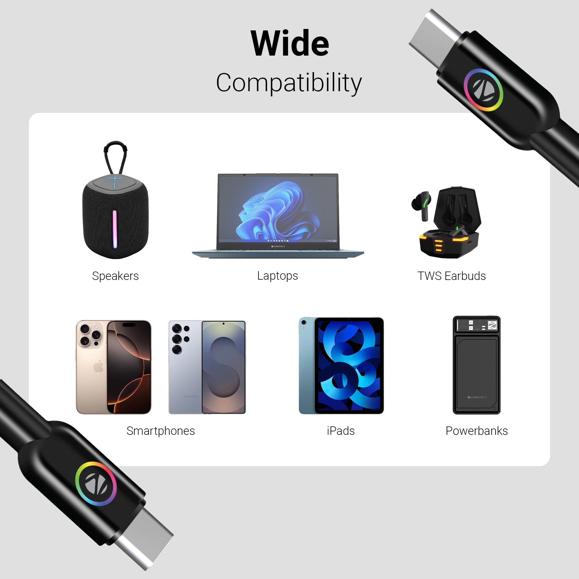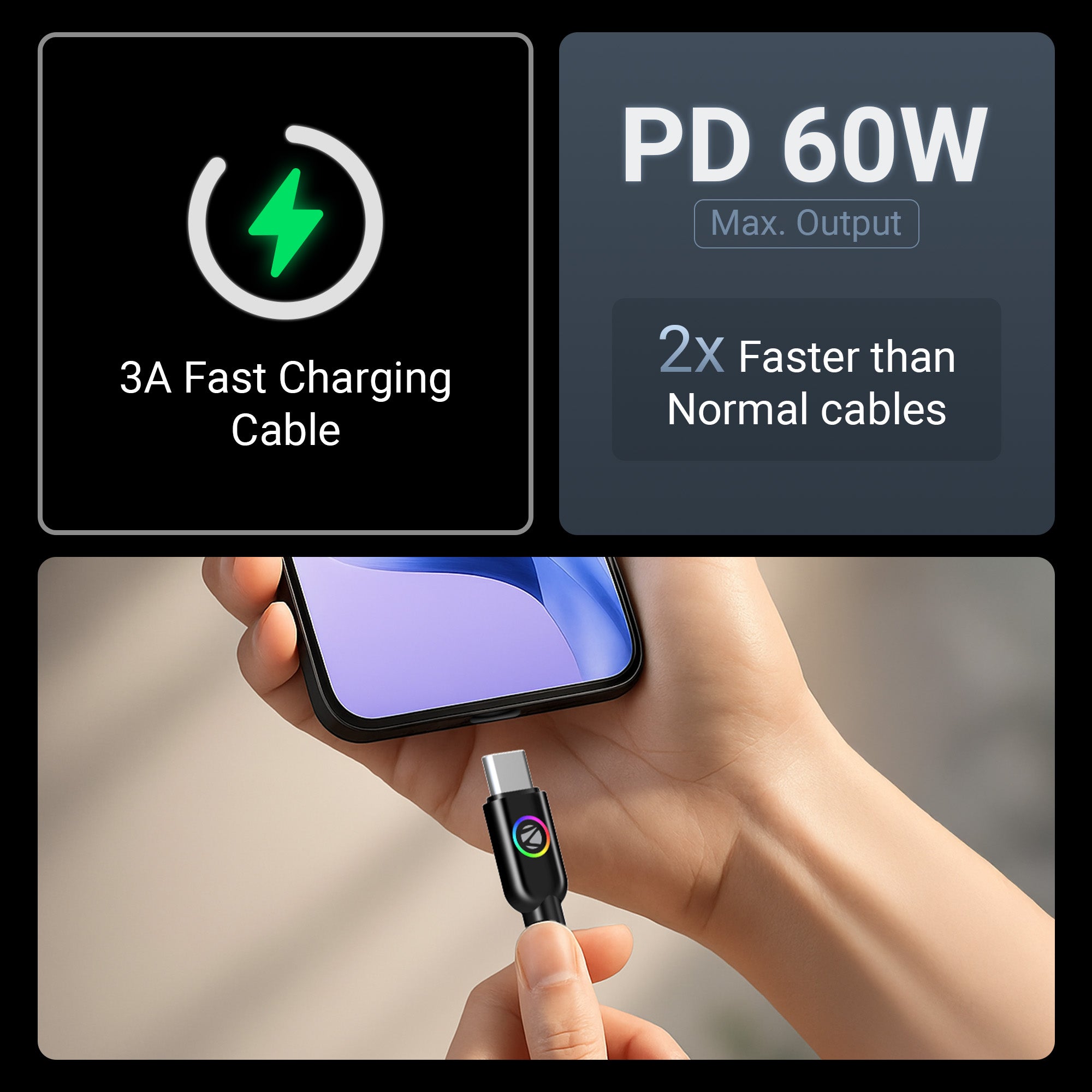 PD 60W (Max.) | 3A (Max.) | 1 Meter Braided Cable | Multicolor Breathing LED illumination | Charge & Sync | Rapid Charging | Superior Durability | Mobile/Tablet/Laptop Compatible | Country of Origin : PRC | Package Content | Cable : 1 Meter