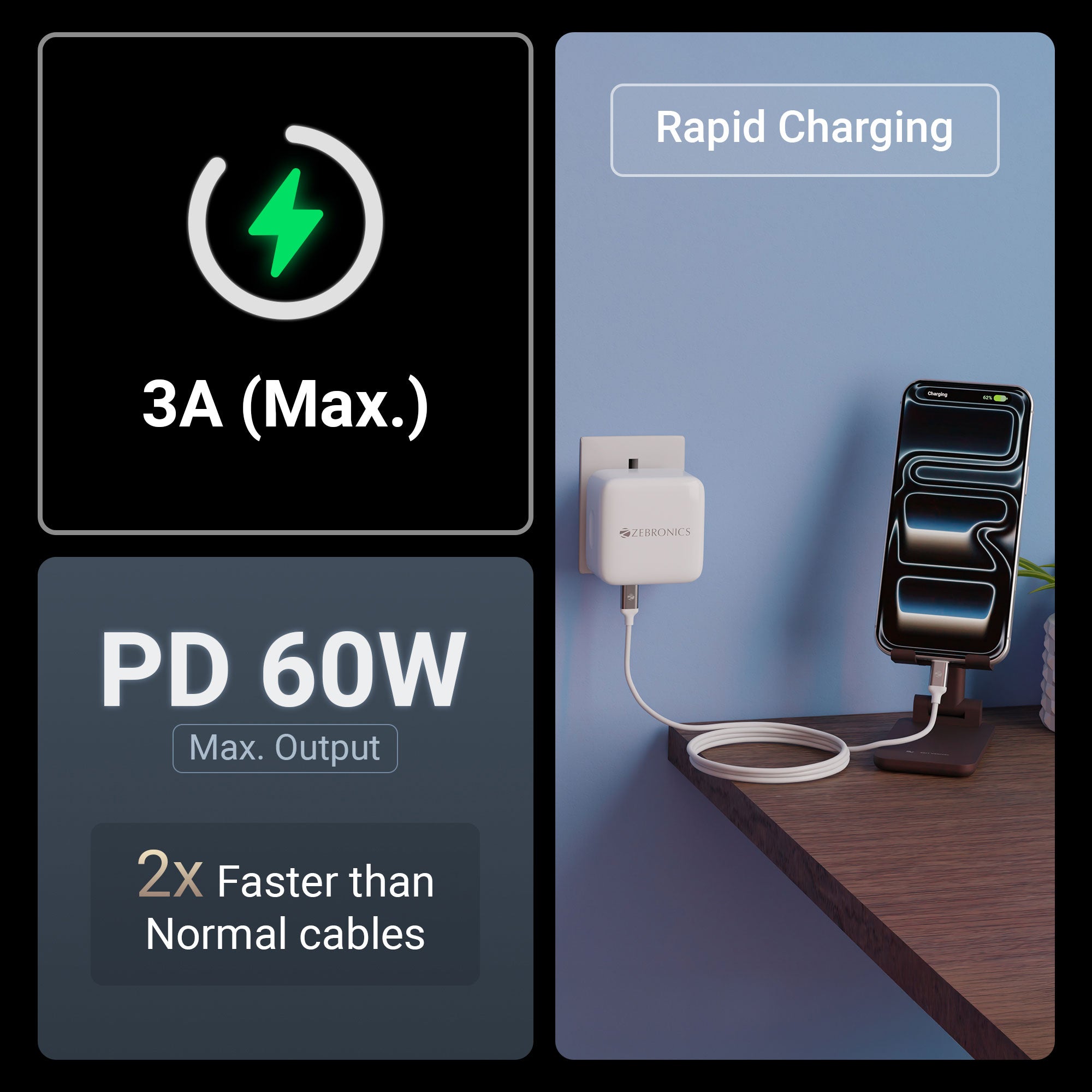 PD 60W (Max.) | 3A (Max.) | 1 Meter Cable | Charge & Sync | Rapid Charging | Superior Durability | Mobile/Tablet/Laptop Compatible | Package Content | Cable : 1 Meter