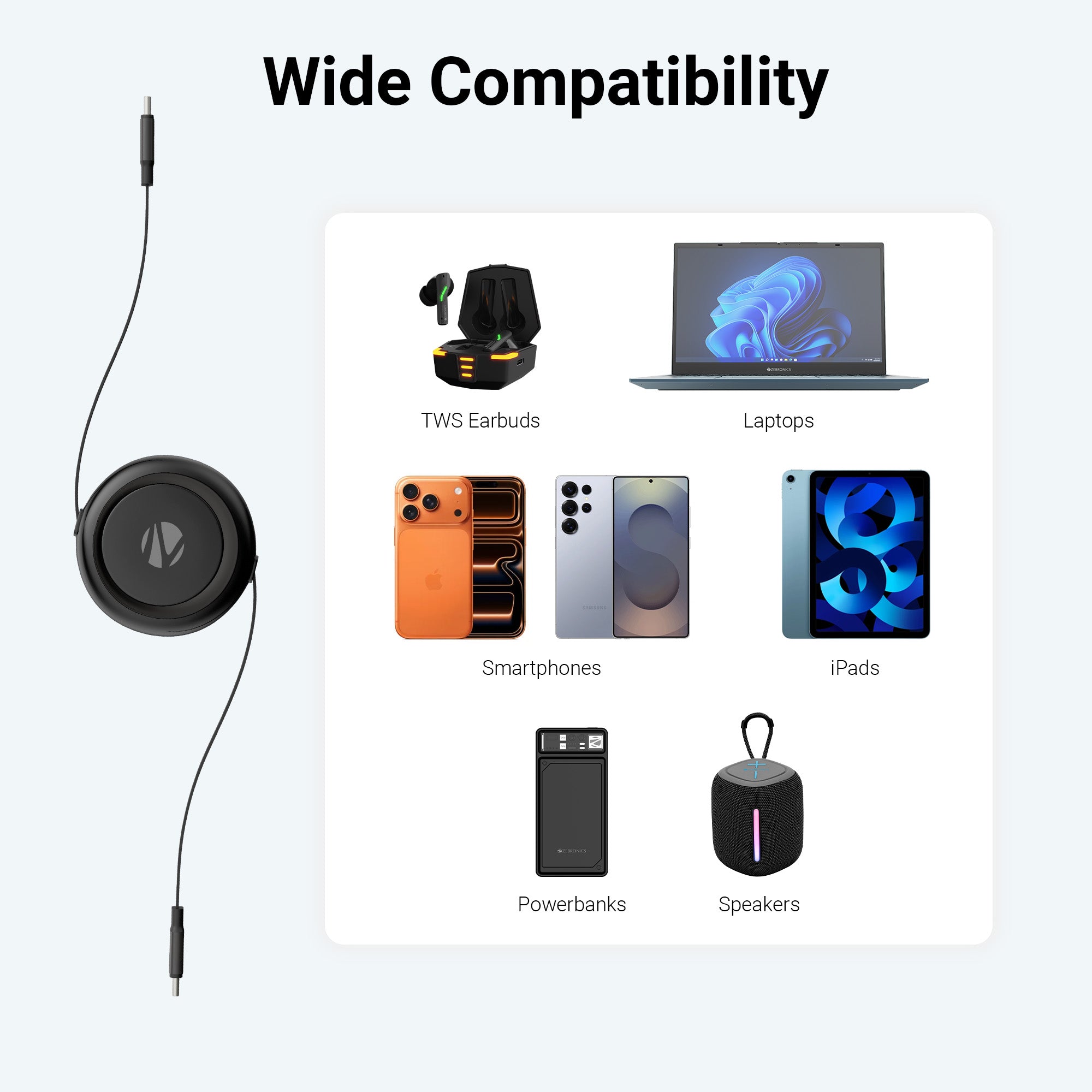 PD 60W (Max.) | 3A (Max.) | 1 Meter Retractable Cable | Charge & Sync | Rapid Charging | Superior Durability | Mobile/Tablet/Laptop Compatible | Country of Origin : People’s Republic of China | Package Content | Cable : 1 Meter